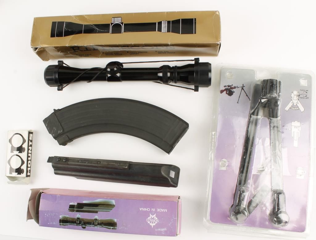 Includes receiver scope mount and rings, barrel mount bipod, 3-9X32 scope and (1) 30 round magazine. All in very good condition.