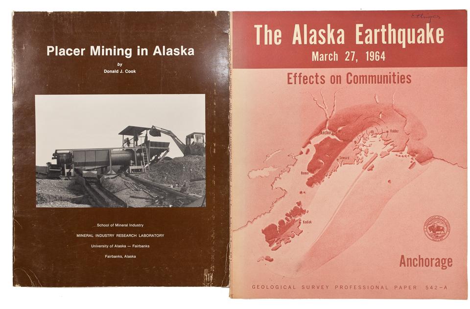 Lot of 2. 1) Placer Mining in Alaska by Donald J. Cook. Published in June 1983 by the Mineral Industry Research Laboratory at the University of Alaska, Fairbanks. Book has brown cover with photo of mining machine, first two pages are loose inside cover, 157 pages. 2) The Alaska Earthquake, March 27, 1964 Effects on Communities, Geological Survey Professional paper 542-A by Wallace R. Hansen. Published in 1965 by the United States Government Printing Office. Paperback, faded pink/red cover with white/red lettering, maps in envelope on back cover, 68 pages.