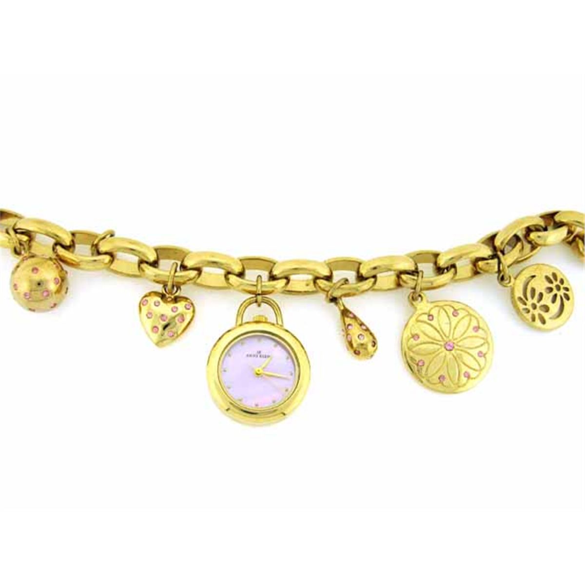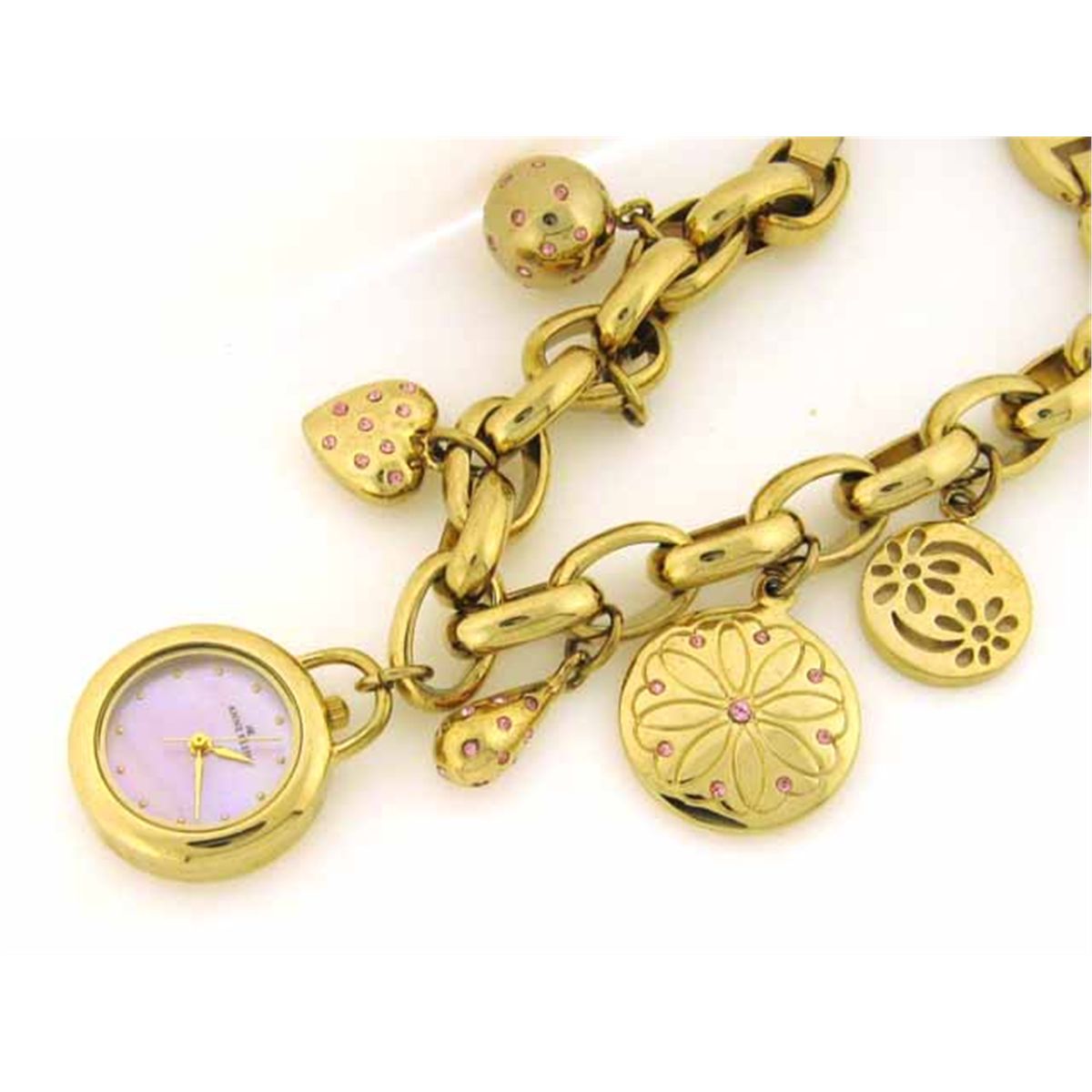 Gold tone pendant case; Gold tone chain bracelet; Light pink mother of pearl dial; Dangling gold tone charms with pink accents