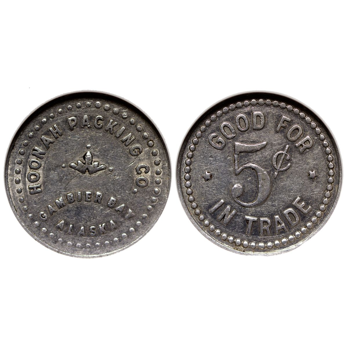 NGC certified. SN1583701-010. Good For / 5c / In Trade. R / al / 21mm. The company operated from 1916-1925; it also issued tokens at Bering River and Hoonah. Gambier Bay is off the east coast of Admiralty Island, 57 miles east of Sitka. R7. XF45.