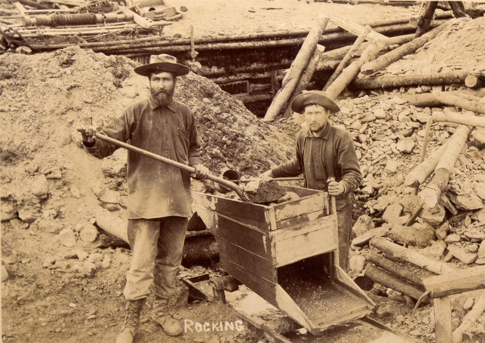 Thought to be from the Alaska diggings, the photo shows two miners working a rocker amidst piles of debris, logs, rocks, etc. “Rocking” is printed in white ink at the bottom center. No photographer is indicated. The focus, clarity and contrast are good. 5 x 7.”