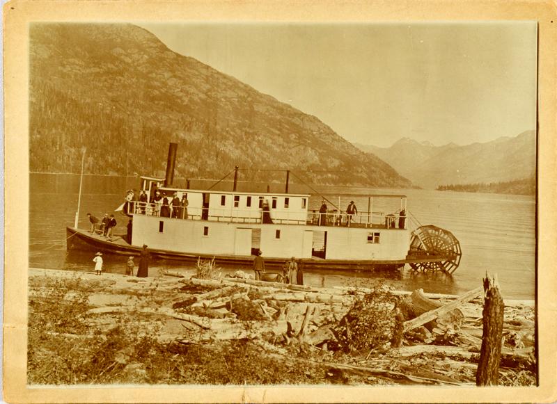 Photograph of a sternwheeler maneuvering close to shore with passengers aboard and a varied crowd on shore. Measures 6 1/2" x 5", mounted on a beige cardstock matte measuring 7 1/4" x 5 1/4". Contrast is medium and focus is good. Two very small tears and one 1/2" ridge in image, otherwise very fine. One tear in matte and image repaired with tape on reverse. The image shows the vessel with what appears to be its anchor rope hanging off its port (shore) side. About 15 passengers, including several women, are visible on board. On shore stands a woman with a small boy and girl, as well as a man standing near a rowboat, two women, and a young man. No photographer listed. "Alaska steamer" appears faintly written in pencil on the reverse. Based on the shore, lake, and vegetation visible, a location in Alaska or the northwest is probable.