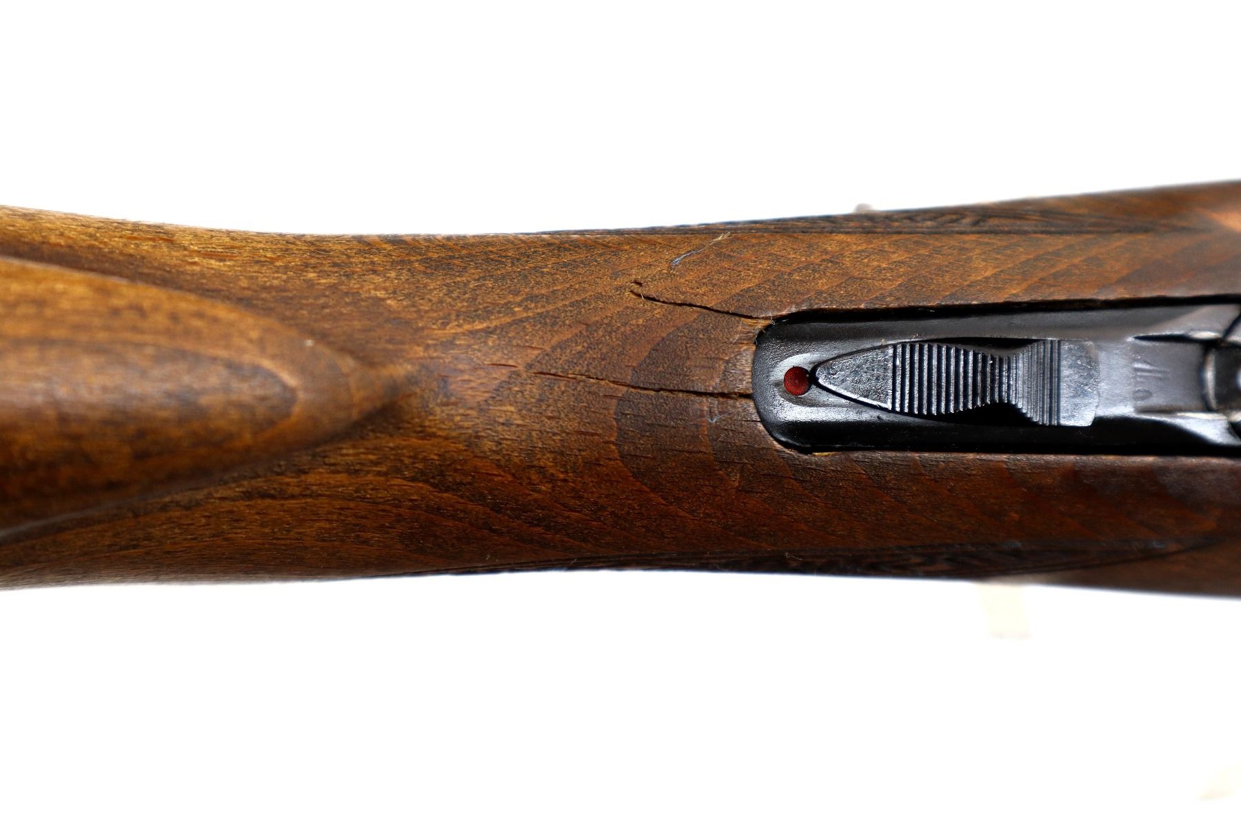 Main Description: Blade front sight with ramp, adjustable u notched rear sight with red fiber optic lines and ramp, blued finish, QD claw mount bases, front ring is drilled and tapped with no plug screws installed, turned down bolt handle, tang safety. One piece wood stock, checkered forearm and pistol grip, cracked behind receiver and trigger guard, cheek rest, brown vented rubber recoil pad which is damaged, 13.75" LOP, grip cap, hinged floor plate, sling swivels.