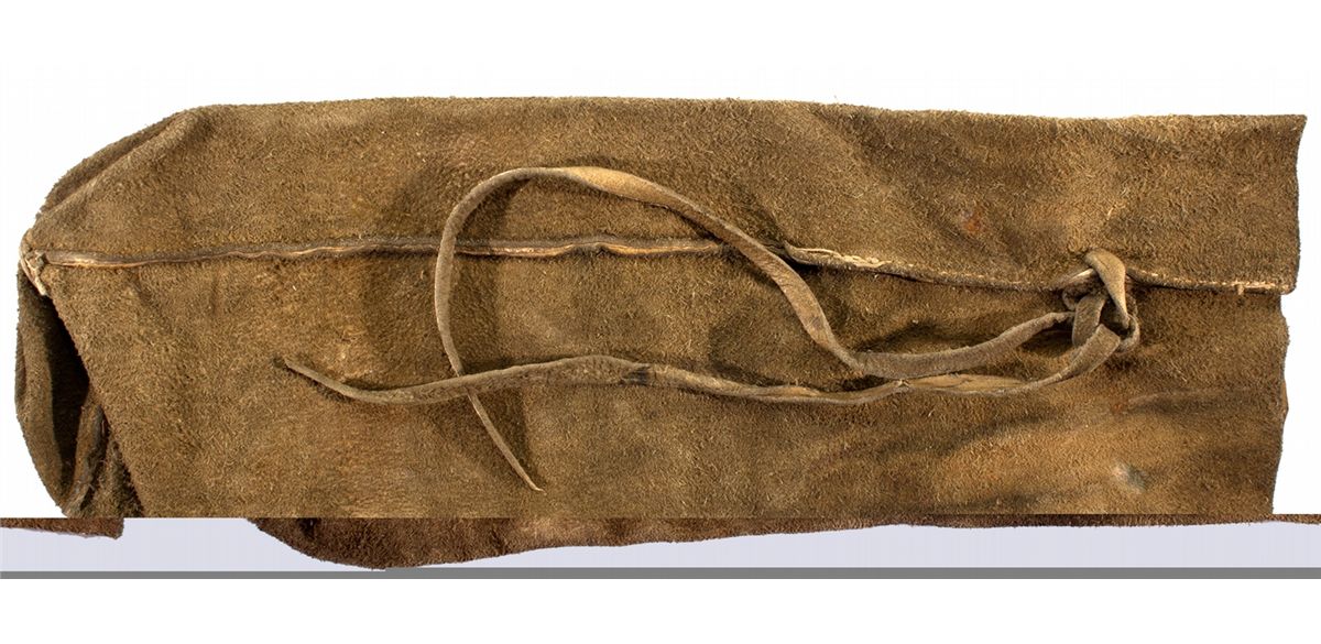 This lot consists of an Alaskan gold rush era rough out buckskin leather gold poke. The tie thongs are still attached and the pouch measures about 14"x 4" and is still in very serviceable condition.