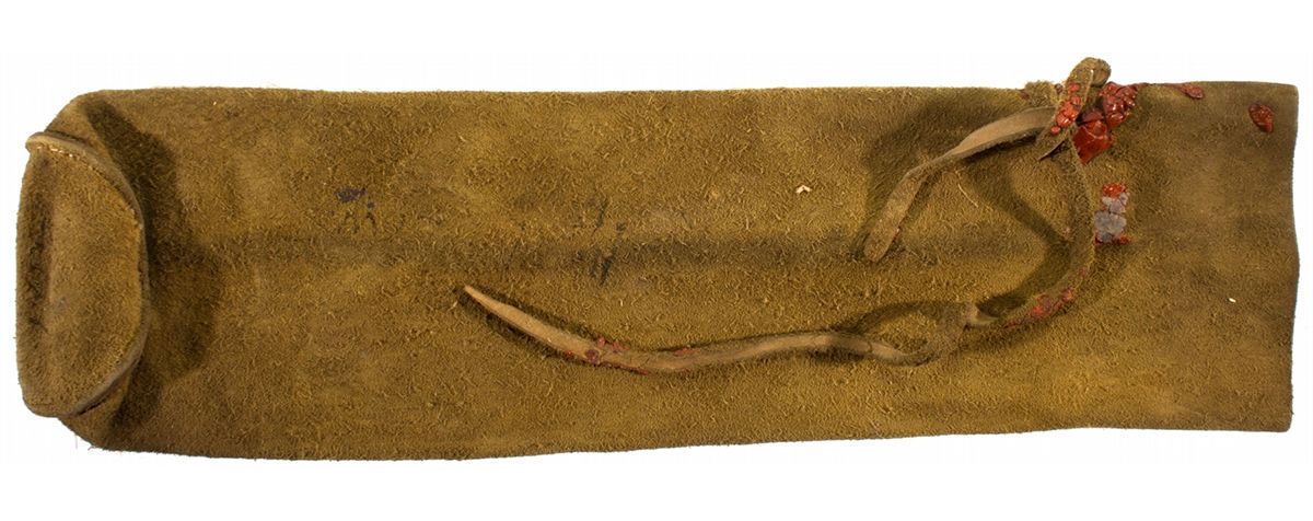 This is a nice leather gold poke from the Alaskan gold rush period. The rough out leather bag measures about 15" x 4.5" and still has some of the wax seal attached to the pouch and the tie thongs. The bag is in very nice condition. In fact, if you want to use it as your own personal poke, it’s ready.
