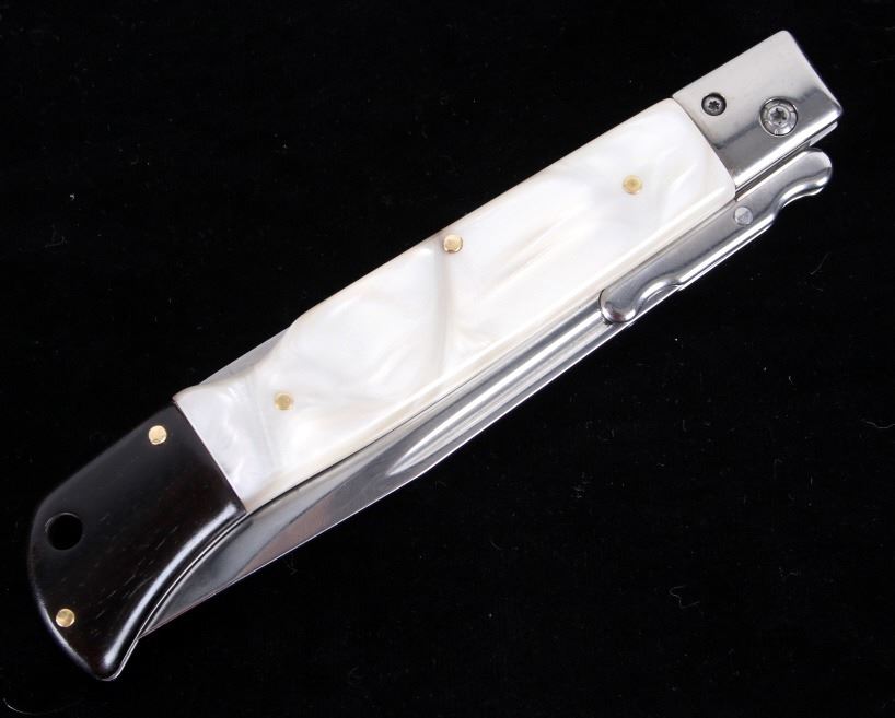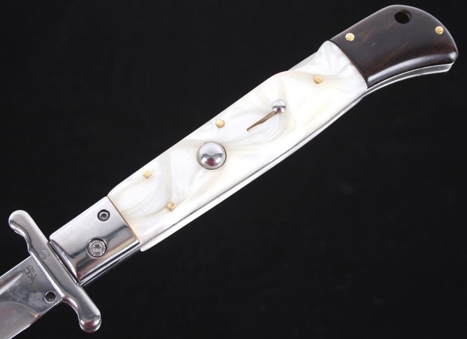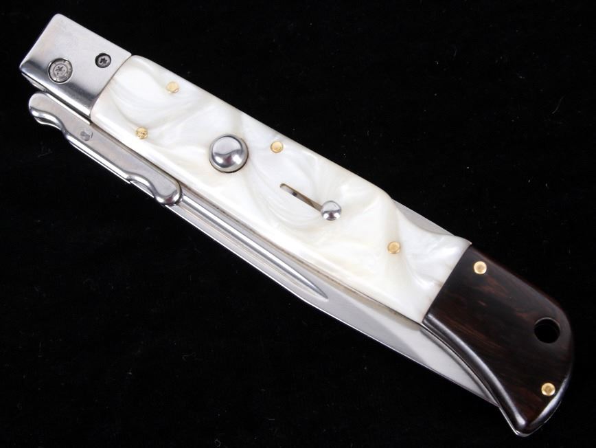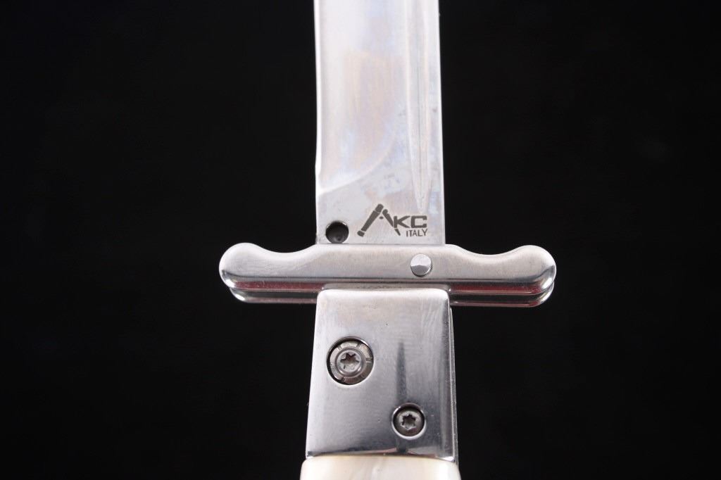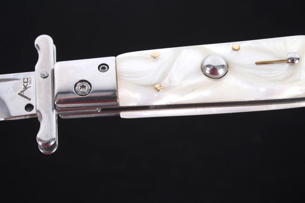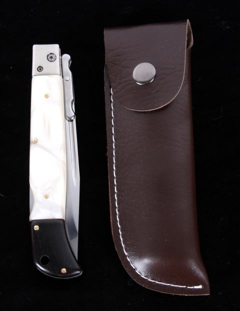 Featured in this lot we have an AKC Italian pearl resin switchblade knife w/ leather sheath. The knife displays a clip point style blade with the grips showing stainless steel bolsters, dark wood pommel, and pearl resin grips. The blade is marked "AKC Italy". The handle displays a push button release to open the blade and swing guard. The lockback lever at the base of the handle closes the blade. The switchblade is in good condition overall and comes with a leather sheath. The knife measures 10 3/4" long with the blade being 4 3/4" long. The knife measure 6" long closed.
