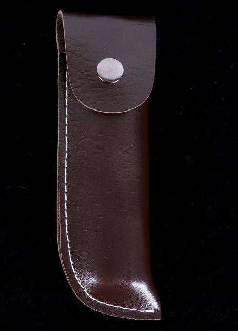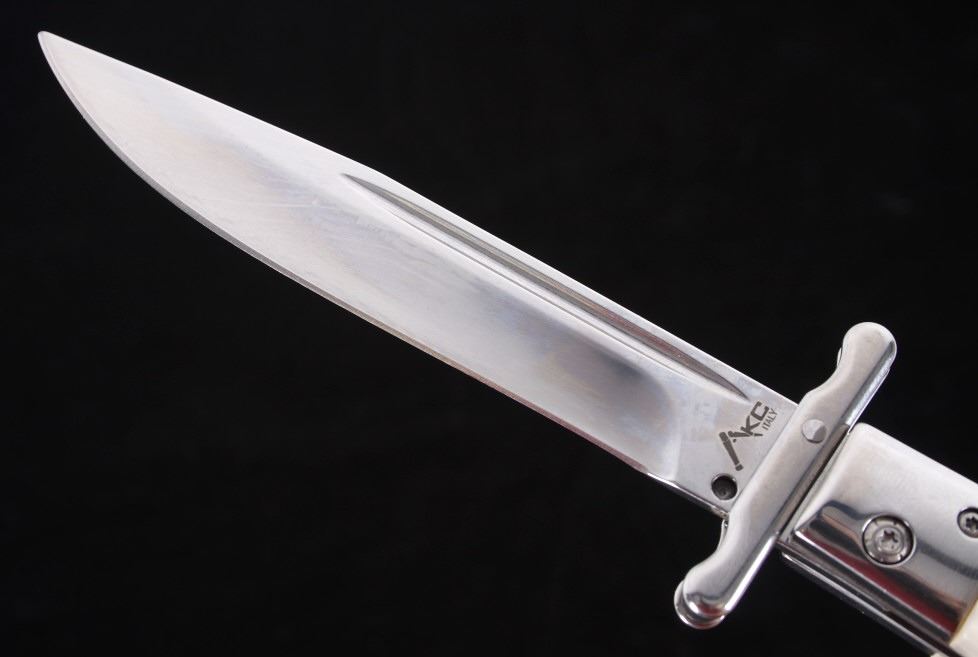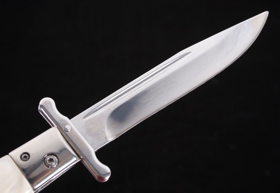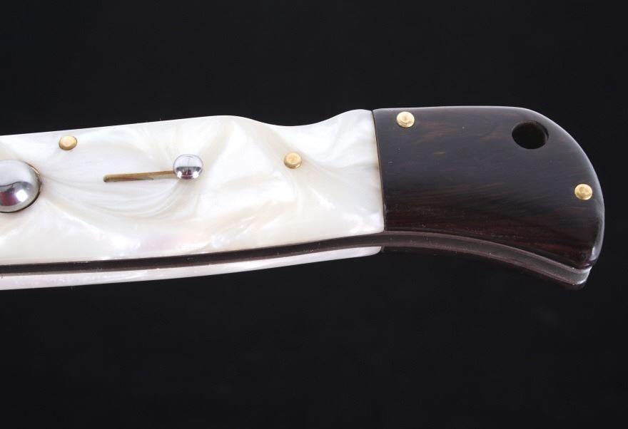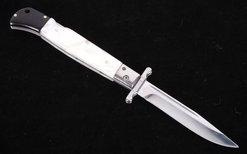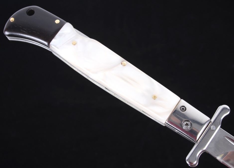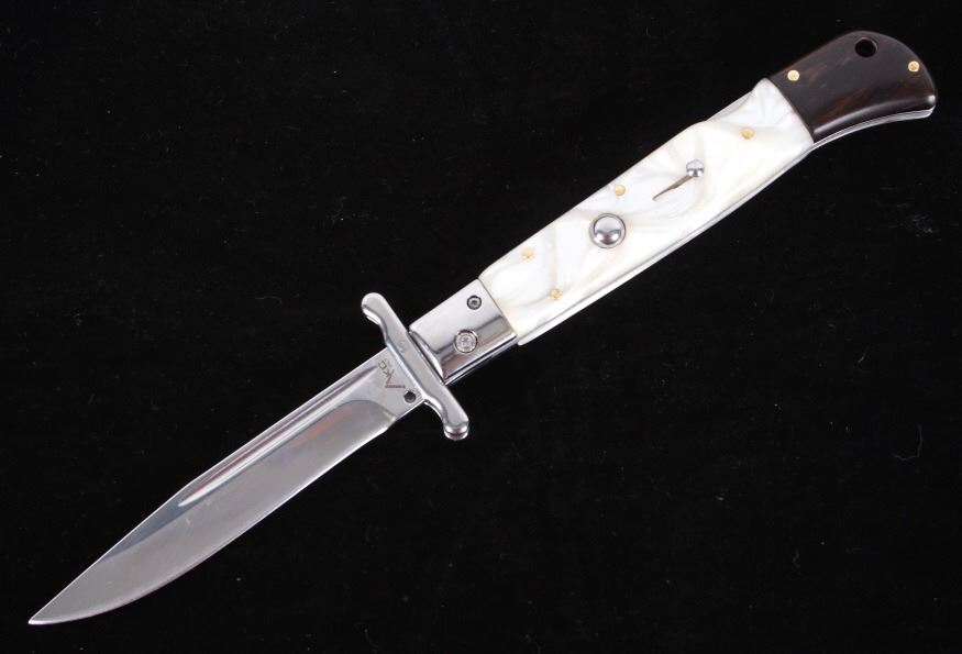 Featured in this lot we have an AKC Italian pearl resin switchblade knife w/ leather sheath. The knife displays a clip point style blade with the grips showing stainless steel bolsters, dark wood pommel, and pearl resin grips. The blade is marked "AKC Italy". The handle displays a push button release to open the blade and swing guard. The lockback lever at the base of the handle closes the blade. The switchblade is in good condition overall and comes with a leather sheath. The knife measures 10 3/4" long with the blade being 4 3/4" long. The knife measure 6" long closed.