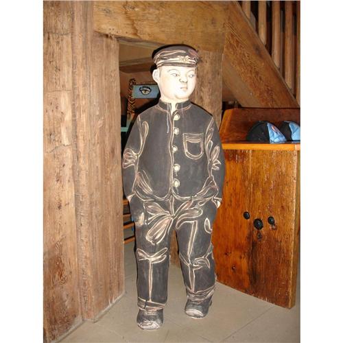 Schoolboy; 2005: Black and white painted “stoneware.” Wearing a black suit and bill cap decorated with off-white piping, and with his hands in his pockets. Height: 38 inches