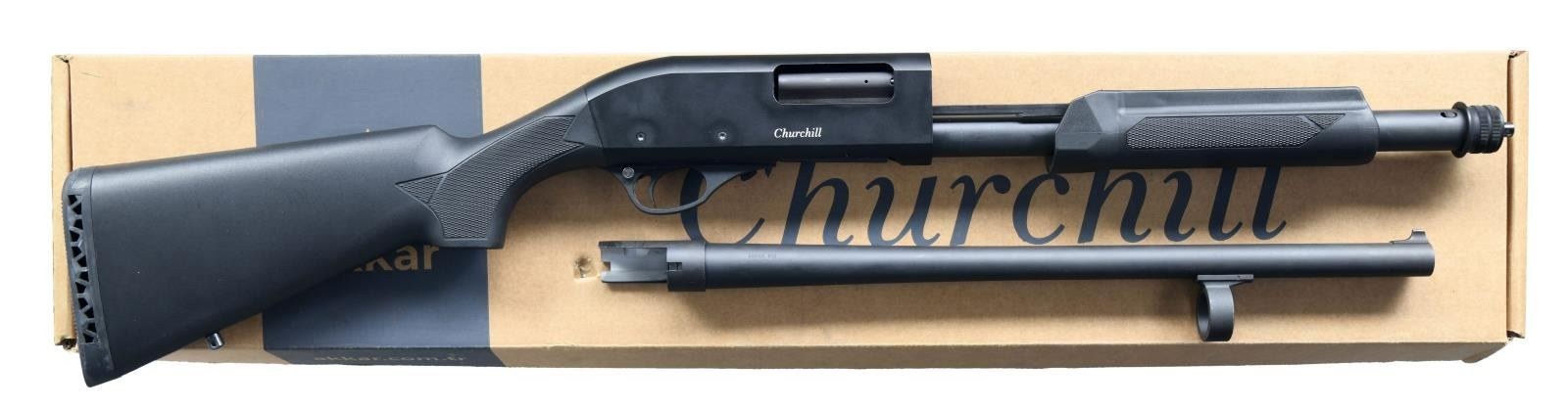 Cal. 12 Ga., 3". S# 20049092. Bbl. 18 1/2" cyl. Ramped bead front sight. Breechblock is stuck & will require attention before gun can be assembled properly. Pistol grip synthetic buttstock & forend. UNATTACHED ACCESSORIES: factory box matching numbered to gun & manual. CONDITION: all aspects near excellent. (23-1476/MJC). MODERN. $300-400.