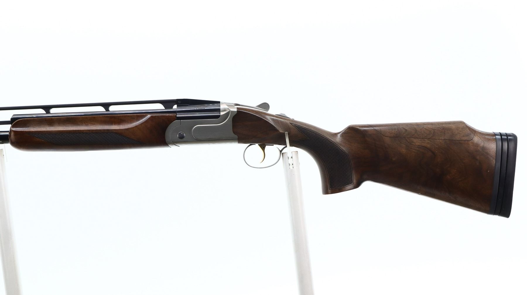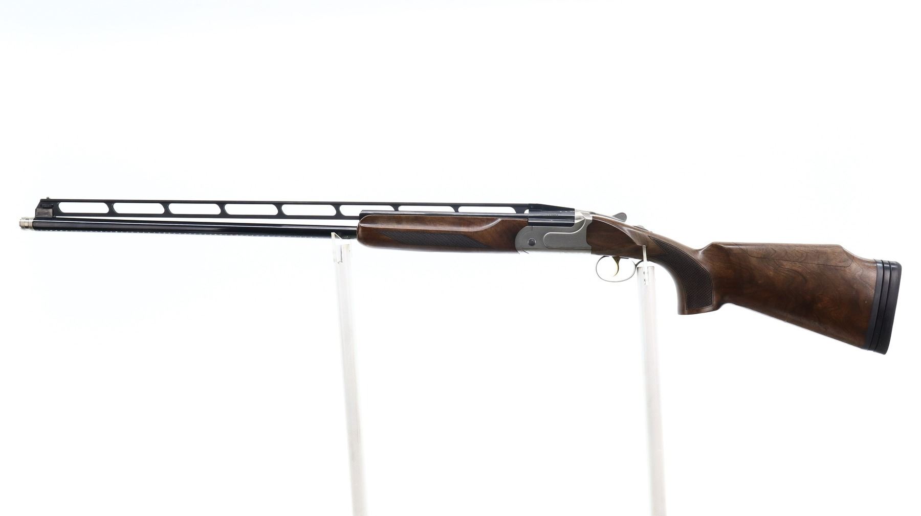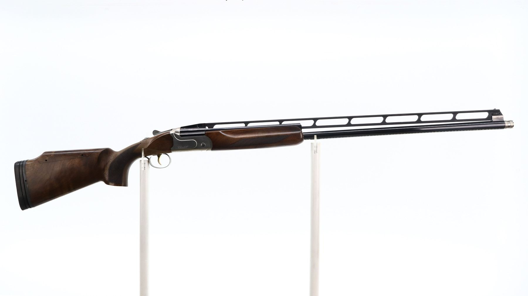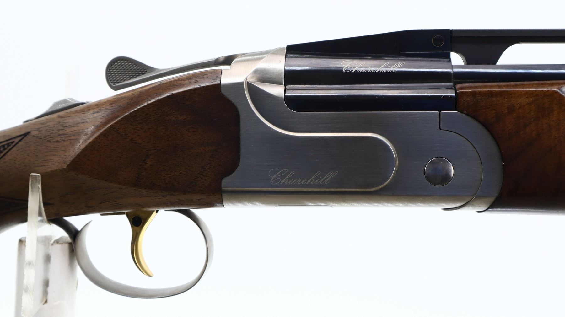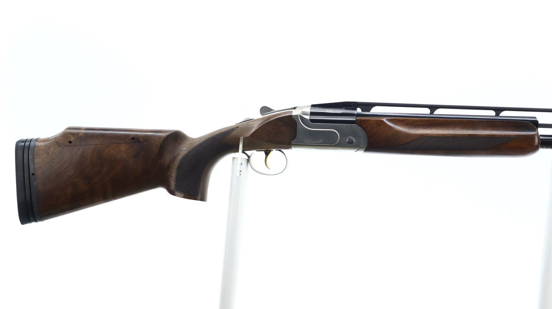 8/10, AKKAR CHURCHILL, MODEL: 206 TRAP UNSINGLE COMBO, CALIBER: 12 G X 3", COMES WITH CASE, SPARE BARREL, 5 CHOKES, BORES ARE EXCELLENT. REMOVABLE CYLINDER CHOKE INSTALLED. WHITE FRONT AND MID RIB BEAD, ADJUSTABLE HIGH VENT RIB, BLUED STEEL BARREL, SILVER RECEIVER, MANUAL NON SELECTIVE SAFETY, EJECTOR, SINGLE GOLD INERTIA TRIGGER ADJUSTABLE FOR LENGTH. TWO PIECE WOOD STOCKS, CHECKERED FOREARM AND PISTOL GRIP, ADJUSTABLE CHEEK REST, BLACK RUBBER RECOIL PAD WITH SPACER, NICELY FIGURED WOOD GRAIN. SECOND BARRE: 32", EXCELLENT BORES, REMOVABLE MOD AND IC CHOKES, WHITE FRONT AND MID RIB BEADS, POLISH BLUED FINISH WITH VENT RIB, EJECTORS. SPARE CHOKES ARE: FULL AND IMPROVED MOD WITH WRENCH AND ALLEN KEYS. METAL FINISH SHOWS SOME SCRATCHES, HANDLING MARKS AND WEAR. STOCKS SHOW SOME MARKS, SCRATCHES AND WEAR. ACTION: HINGED OVER UNDER SHOTGUN, BARREL LENGTH: 32", SERIAL # 16314404, CLASS: CANADIAN NON RESTRICTED, CONDITION: 8/10