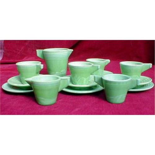 Beautiful child's tea set made of jade green Akro Agate glass.