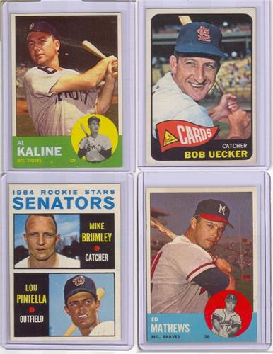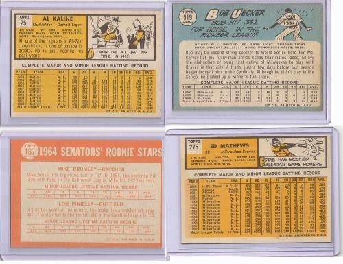 AL KALINE, BOB UECKER, LOU PINELLA, & ED MATHEWS BASEBALL CARDS. Consists of one Al Kaline 1963 Topps baseball card. #25. Ungraded. Consists of one Bob Uecker 1965 Topps baseball card. #519. Ungraded. Consists of one Lou Pinella 1965 Topps Rookie Card. #167. Ungraded. Also consists of one Ed Mathews 1963 Topps baseball card. #275. Ungraded.