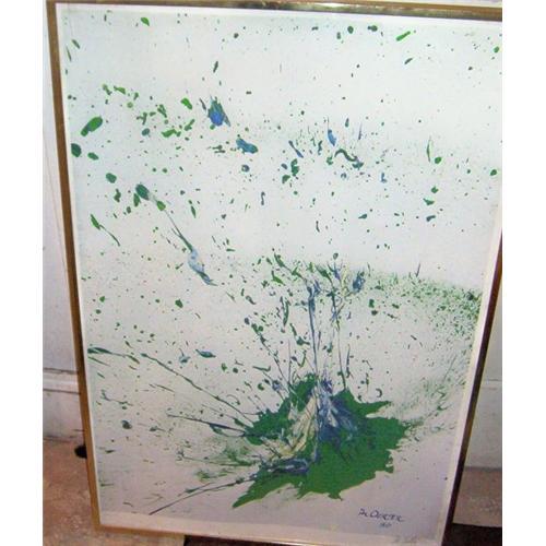 This a rare HTF earlier Al Oerter Impact painting print signed and numbered ..This I found in the metal with plexa-glass instead of glass frame 36.5 inches H X 24.5 inches W and weighs 5 lbs 13.5 oz. before shipping...There are two places the p-glass is cracked...This is a Giclee paper print with a 2 inch white boarder, numbered, and signed by Al Oerter, dated 1980...Al Oerter is one of only two track stars (Carl Lewis being the other) to win the same Olympic event four times in a row...He's the only one to set four consecutive Olympic records...1956 in Melborne, 1960 in Rome, 1964 in Tokyo, and 1968 in Mexico City...In 1980 Oerter was commissioned to create a piece of abstract art in support of the US Oympic Team...The commission required that he create the art utilizing an Olympic weight discus...Oerter has thrown over 500,000 times in his life and the Impact series represents that distant impact point...The results are dramtic , colorful, and freezes the moment of impact...The results was widely distributed in prints and his originials were sold successfully at the auction house , Christies in N.Y...The number is 0295/1984 on bottom corner left and on right bottom is Al Oerter real signature...This is a limited edition print...I e-mailed Mr Oerter and sent pictures to make sure he did sign and date this print...Mr Oerter said the print was part of a series of 1984 prints done in support os the USOC...The program was sponsored by Anheuser Bush and was completed in 1980...Said ...