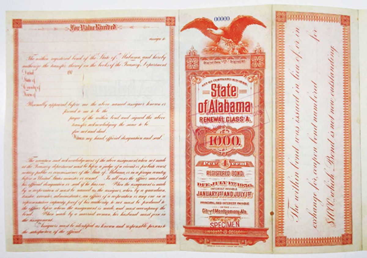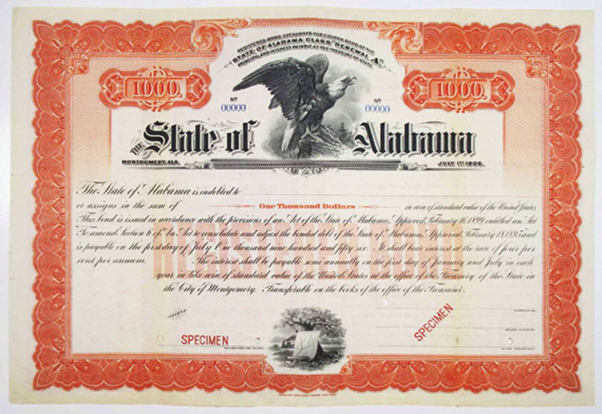 Montgomery, AL. State of Alabama, 1906 $1000 Specimen 4% Registered Renewal Bond, VF ABN Orange. Alabama is a state in the Southeastern region of the United States, bordered by Tennessee to the north; Georgia to the east; Florida and the Gulf of Mexico to the south; and Mississippi to the west.