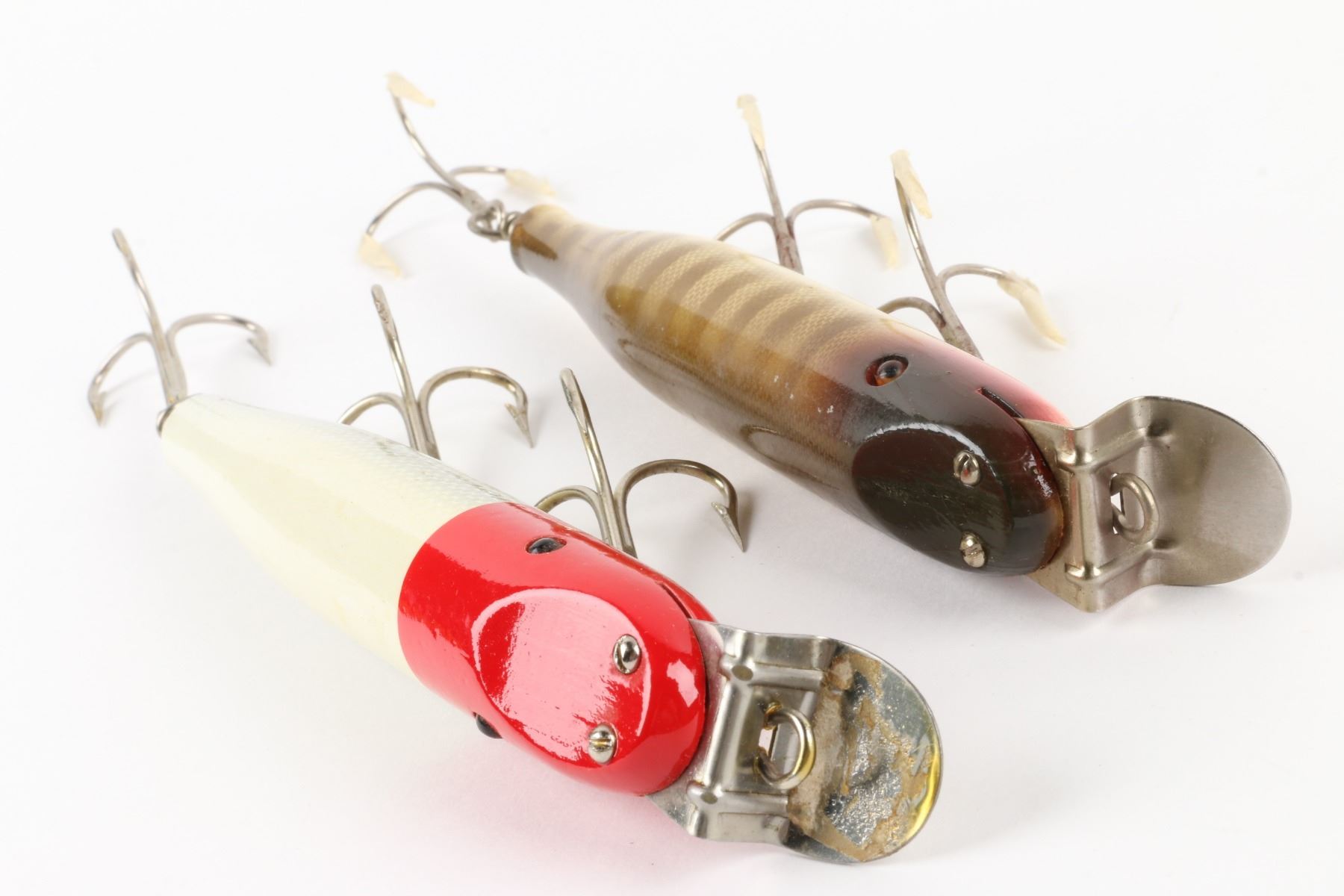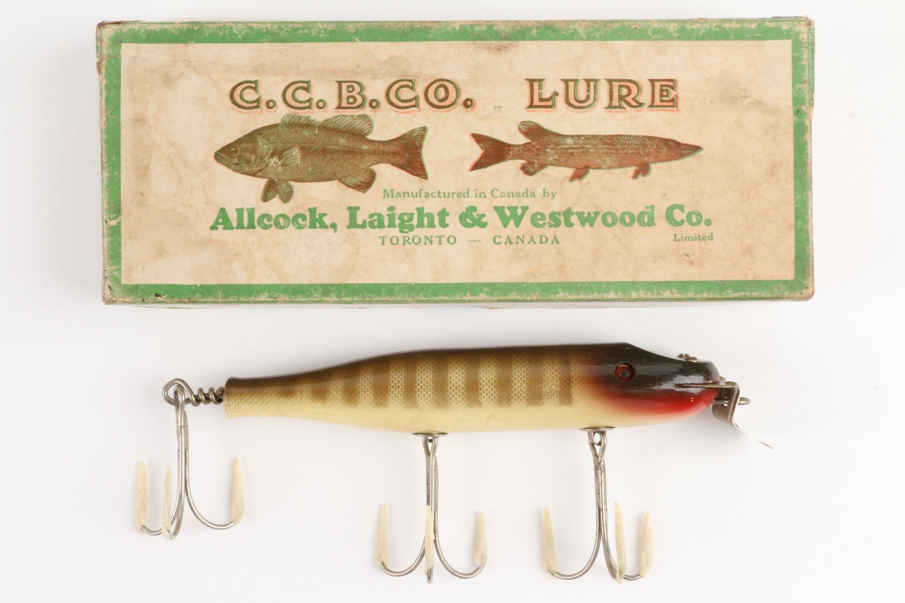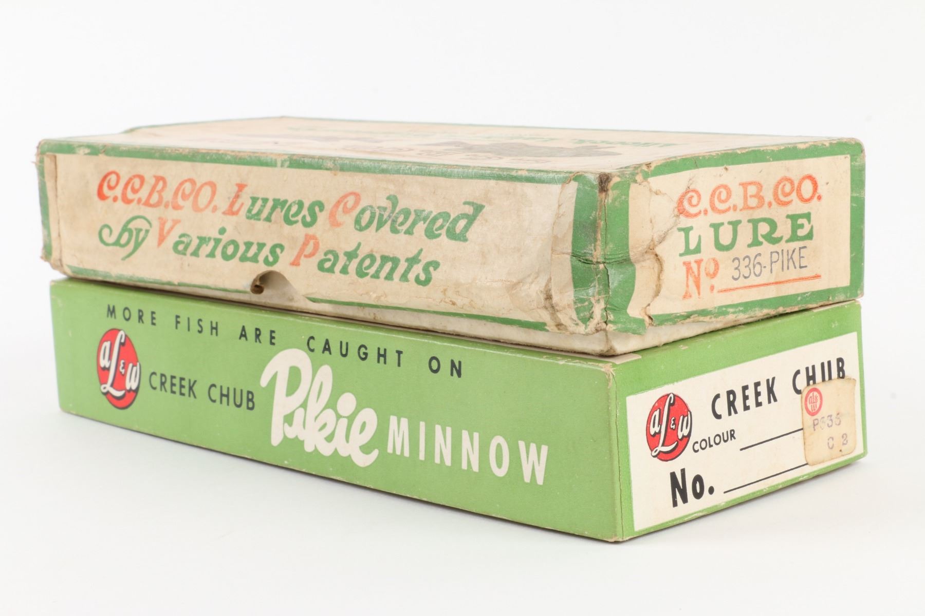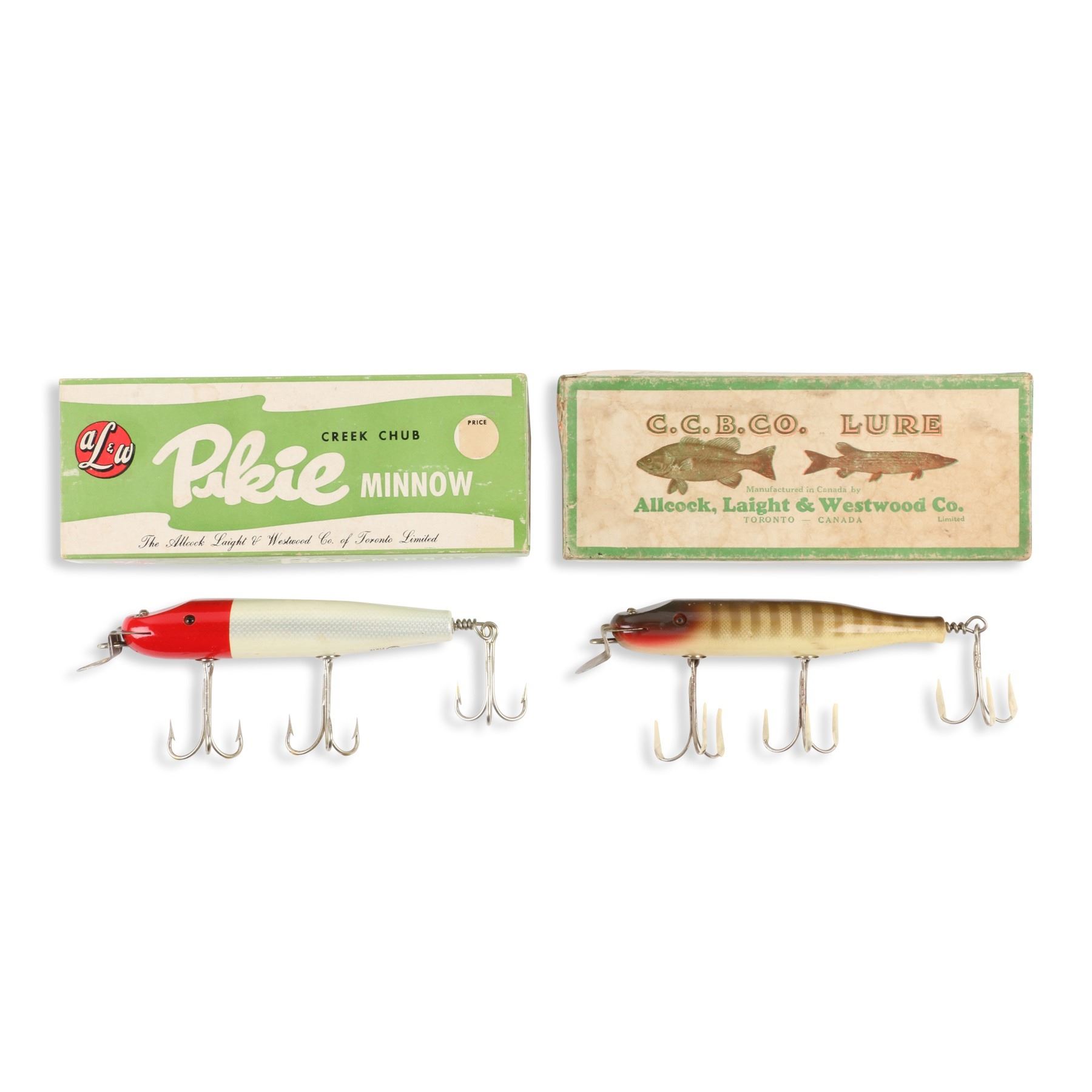 AL&W, Canada. 1940s to 1950s. Material: Wood. Quantity: 2. Pike scale and Red and White. Grade: VG. 8.25" boxes. Est. $100-125.