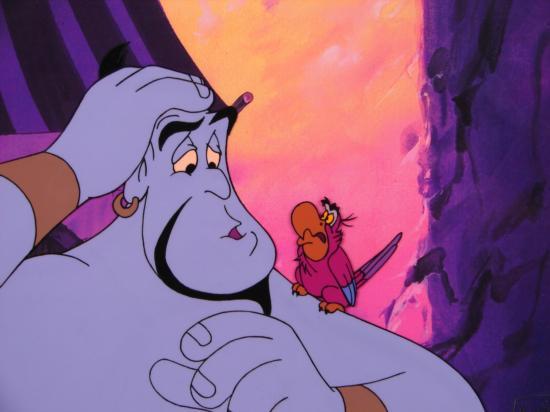 This Animation Production Art Cel comes from the popular Disney TV show Aladdin. The artwork, which has been taken from an episode entitled "Caught By The Tale", shows Genie with the conniving parrot Iago perched on his shoulder. Disney artwork vividly colored and expertly rendered! Production Cel: A hand-painted animation cel that was used to create one scene that appeared in a cartoon. Original Animation Production Cel Overall Dimensions (including mat and 12-field cel set-up): 12 × 15 inches © Disney Walt Disney Television Animation Art seal, LR Episode: 29 Scene: 492 Includes a Certificate of Authenticity Excellent condition Here are some excerpts from the Certificate of Authenticity: