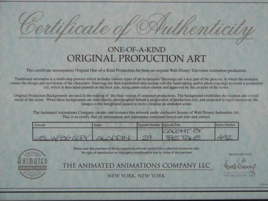 This Animation Production Art Cel comes from the popular Disney TV show Aladdin. The artwork, which has been taken from an episode entitled "Caught By The Tale", shows Genie with the conniving parrot Iago perched on his shoulder. Disney artwork vividly colored and expertly rendered! Production Cel: A hand-painted animation cel that was used to create one scene that appeared in a cartoon. Original Animation Production Cel Overall Dimensions (including mat and 12-field cel set-up): 12 × 15 inches © Disney Walt Disney Television Animation Art seal, LR Episode: 29 Scene: 492 Includes a Certificate of Authenticity Excellent condition Here are some excerpts from the Certificate of Authenticity: