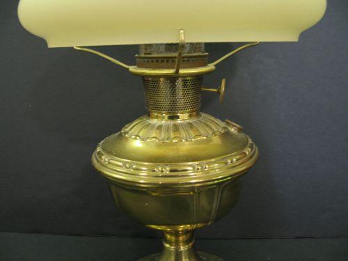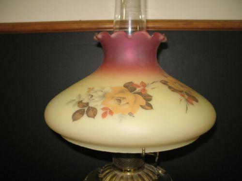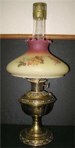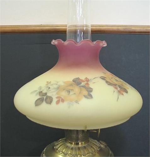 ALADDIN TABLE LAMP. Brass lamp with floral decorated Burmese glass shade. Marked on burner knob “Aladdin, Model No. 11”. Unelectrified. 26” H