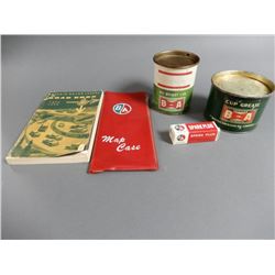 LOT OF 5 B- A BOWTIE & B/A COLLECTIBLES B-A CUP GREASE CAN- SURFACE SCRATCHING- B-A LB. GREASE CAN - STAINING- SPARK PLUG WITH BOX ROAD MAP P...