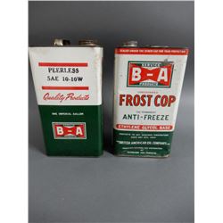 LOT OF 2 B-A BOWTIE IMP. GAL CANS FROSTCOP ANTI-FREEZE- PEERLESS - CORRECT CAPS- DENTING & WEAR ON