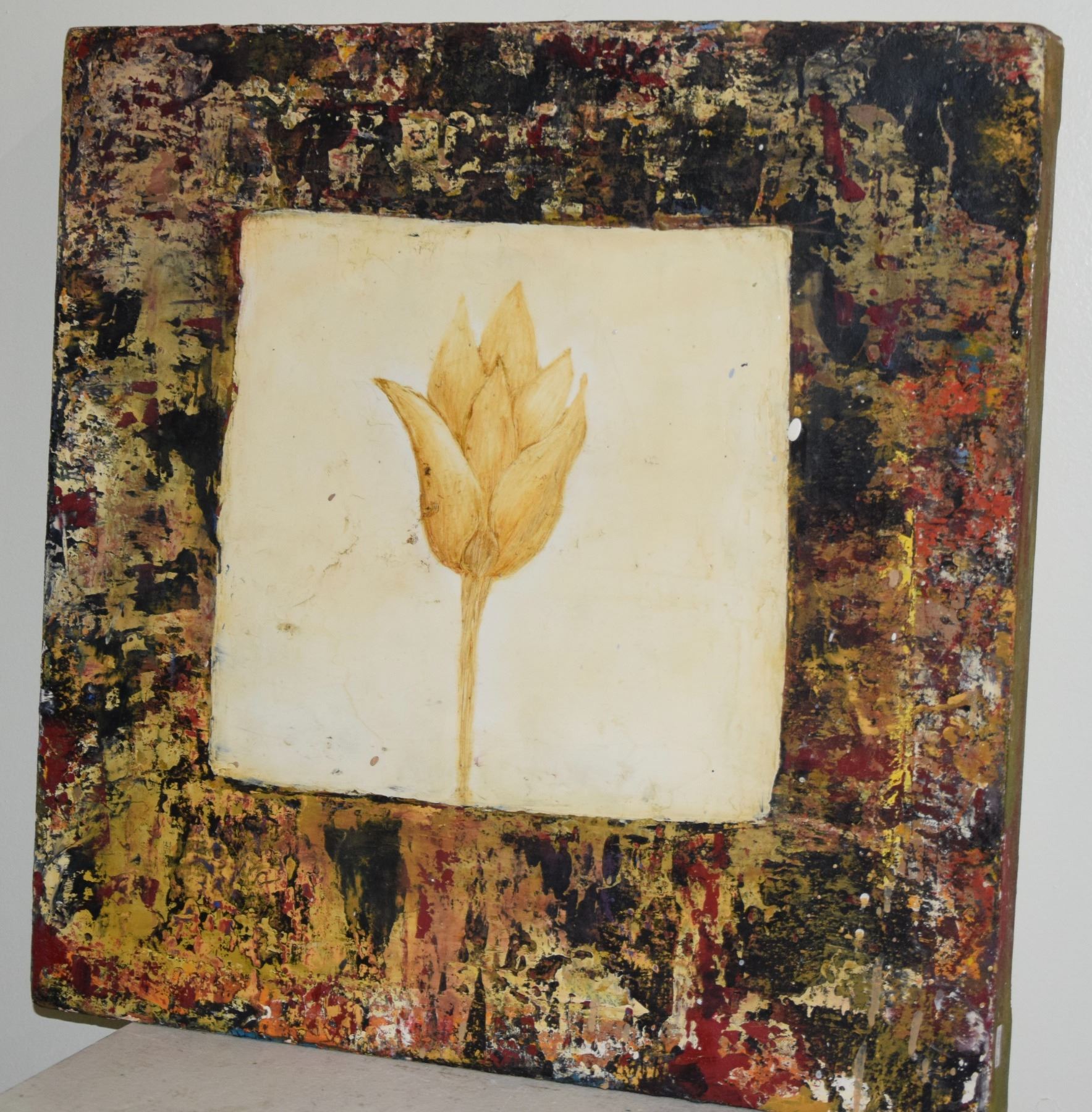 ALAN LEITNER MIXED MEDIA, "ARTICHOKE"; SIGNED ON REVERSE (UNFRAMED 19 3/4" X 20")