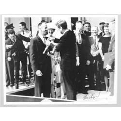 ALAN SHEPARD: (1923 - 1998) American astronaut, a member of the Mercury team and the first American in space. Excellent S.P. 10" x 8" color showing Shepard beaming as the Distinguished Service Medal is pinned to his chest by President John F. Kennedy on May 8, 1961, boldly signed (later) at lower-right. A limited edition signed photo, nicely matted, fine condition. $100-150