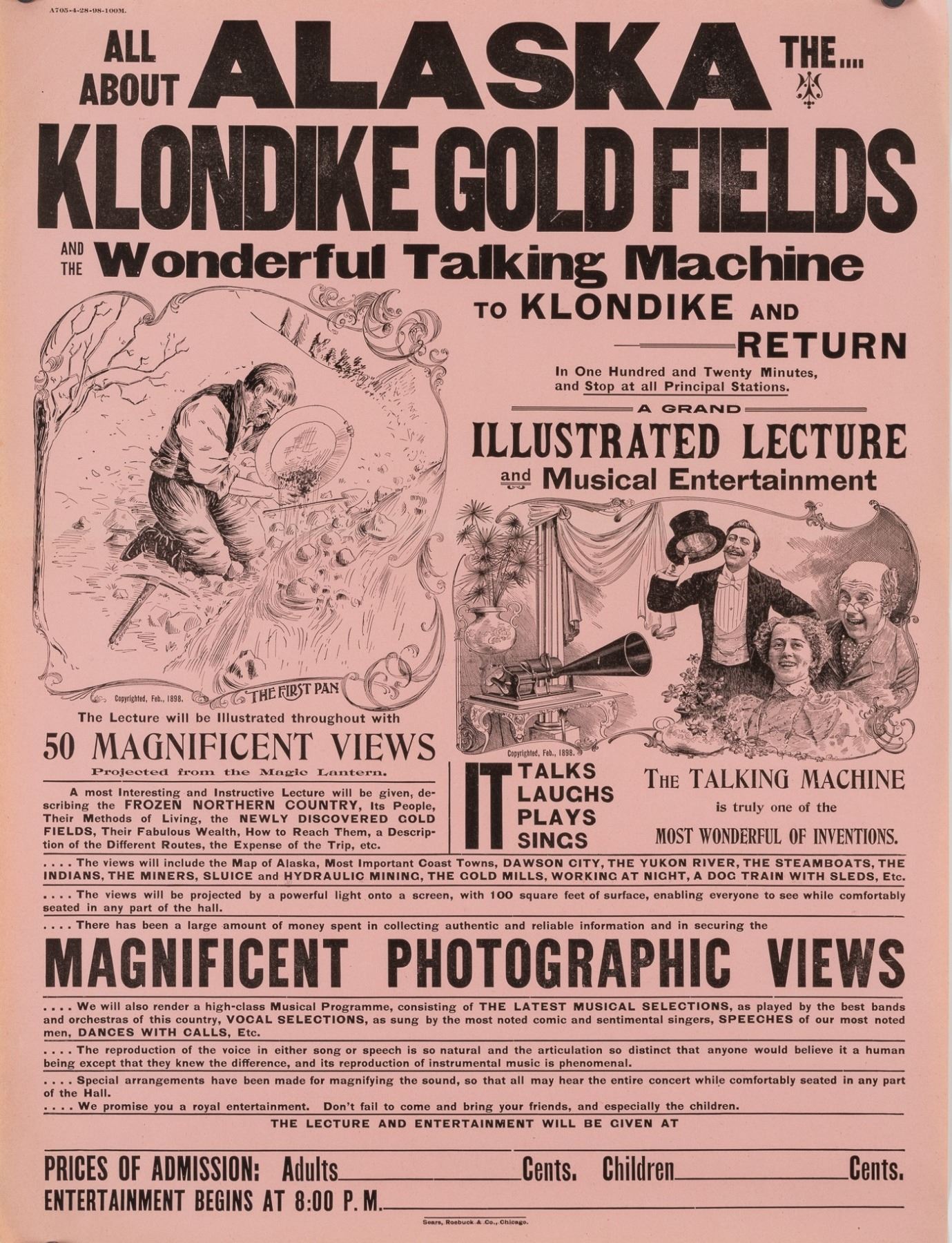 Alaska Gold Rush - Broadside advertising a show and lecture 'All About Alaska The Klondike Gold Fields and the Wonderful Talking Machine to Klondike and Return.' Sears, Roebuck, & Co., Chicago, [1898], 24 x 18 inches, one horizontal fold.