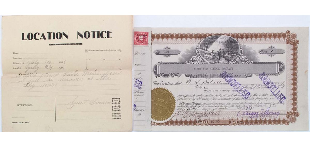 ALASKA PAPER LOT, DATED 1901-1922, LOT OF 2: Mine location notice, Prince William Sound, District of Alaska, dated 1901. 2) Stock, Nome And Sinook Company, Alaska, dated 1922.