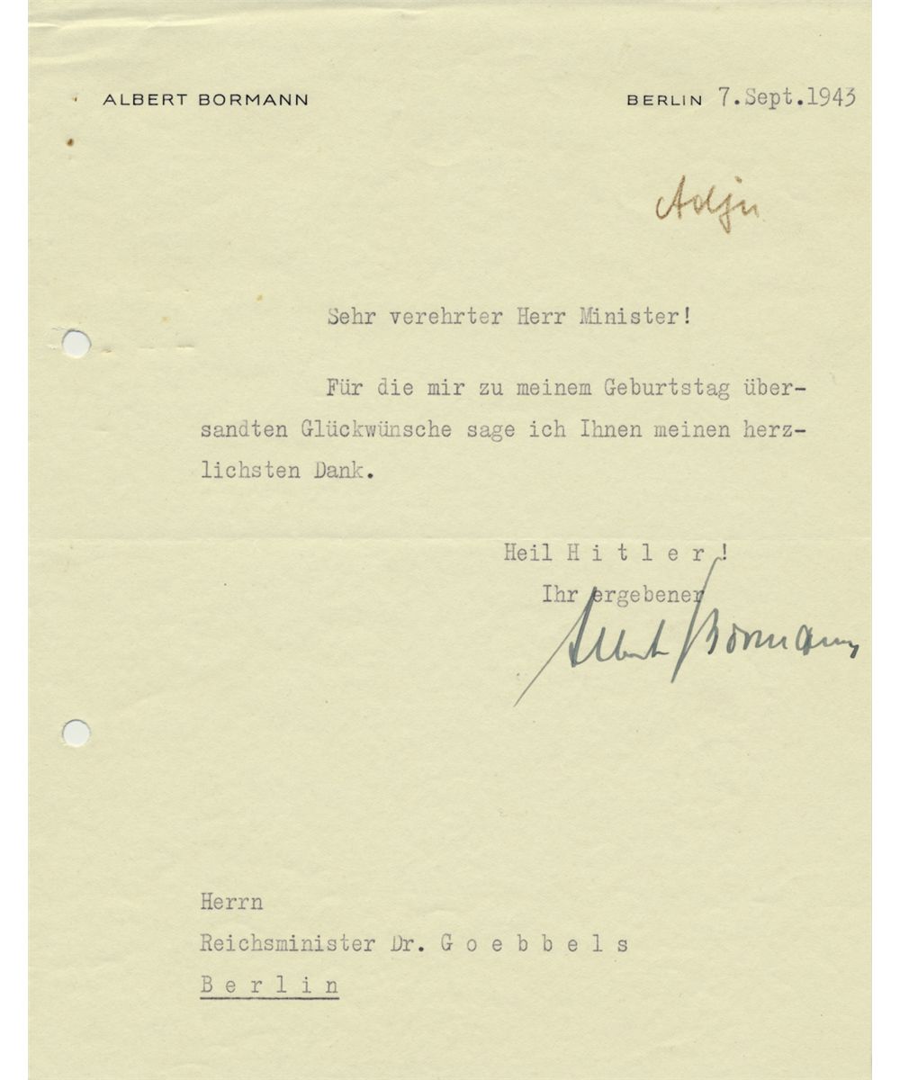 (1902 - 1989) Wehrmacht general and adjutant to Adolf Hitler. Hitler much liked and trusted Bormann, although he and his brother Martin disliked each other intensely. War-date T.L.S. on his personal letterhead, 1p. 8vo., Berlin, Sep. 7, 1943 to Minister of Propaganda JOSEPH GOEBBELS sending his "heartiest thanks" for having been remembered on his birthday and sending regards. File holes at left, else very good.