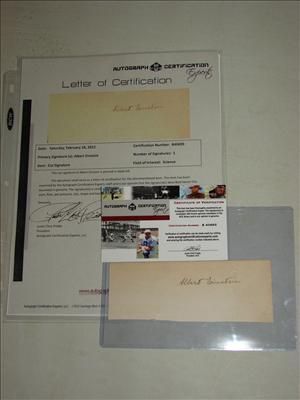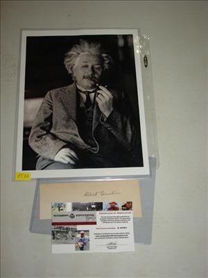 CUT SIGNATURE OF ALBERT EINSTEIN IN BLACK INK AND PHOTO PRINT. SIGNATURE COMES WITH LETTER OF CERTIFICATION FROM ACE (AUTOGRAPH CERTIFICATION EXPERTS) #B40693. AS SHOWN. VIEW PICTURE FOR DETAIL.