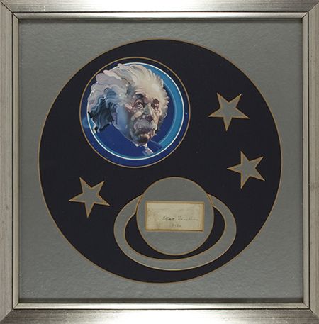 (1879-1955) American physicist whose Theory of Relativity and studies of mass and energy relationships revolutionized the field of physics. Signature on a small slip adding 1930, fancifully matted with stars and a planet and set into a silver frame. Toning and a central fold above signature, still good condition, not examined out of frame.