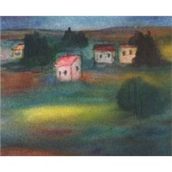 Landschaft mit Häusern. Mischtechnik 1969. - <U>Signiert</U> und datiert. Auf kräftigem strukturierten Vélin. Größe: 25,8 x 32 cm. Mit winziger Farbfehlstelle sowie kleiner Bereibung in der unteren linken Ecke.