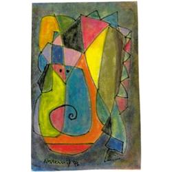 Geometrische Komposition. Mischtechnik 1992. - <U>Signiert</U> und datiert. Auf veloursbeschichtetem Vélin. Größe: 19,4 x 12,6 cm. Gering wellig. Unter Glas gerahmt.