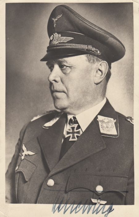 (1885 - 1960) Field Marshal in the Luftwaffe and at Nuremburg was tried for war crimes. Death sentence commuted due to ill health. Fine S.P., 4" x 6" b/w, a half-length pose in uniform boldly signed at bottom in blue ink. Fine.