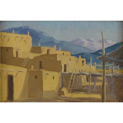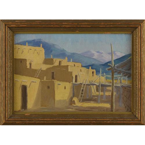 <B>ALBERT LOOKING ELK</B></I>(1888-1941)<BR><I>Taos Pueblo,</B></I> 1925<BR>Oil on board<BR>7in. x 9in.<BR>Signed lower right<BR><BR>Label verso:<BR>Western Galleries, El Paso, Texas (partial label)<BR><BR> <B>Condition Report:</B> Excellent condition. Period frame in excellent condition.<BR><BR><b>Shipping:</b> Requires 3rd Party Shipping (<a target="_blank" href="http://www.heritageauctions.com/common/shipping.php">view shipping information</a>)