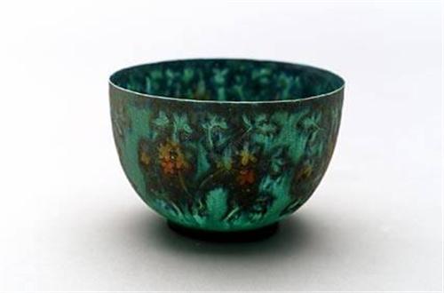 Schale,<BR> Pâte d'Email, formgeschmolzen. Annähernd opake dunkelgrüne Bodenzone, durchscheinende grüne und gelbe Wandung. Dekor aus Blumenzweigen mit gelben sternchenförmigen Blüten, in transluzidem Fensteremail, dunkel konturiert. Matte schwach reliefierte Oberfläche, innen glatt verschmolzen. H.: 6,5 cm, Ø 10 cm. Es handelt sich hierbei um ein Unikat. Bez.: Künstlermarke S für Sèvres, A. DAMMOUSE unter dem Stand. Um 1900-1905<BR> Lit.: Helmut Ricke, Reflex der Jahrhunderte, Die Glassammlung des Kunstmuseums Düsseldorf mit Sammlung Hentrich, Eine Auswahl, Düsseldorf 1989, S. 178. - Klesse, B./Mayr, H., Glas vom Jugendstil bis heute, Slg. Funke-Kaiser, Köln 1981, S. 118-120. - Ray and Lee Grover, Carved & Decorated European Art Glass, Rutland/ Vermont 1970, S. 98 (zu Arbeiten von Dammouse) - Hilschenz, H./Ricke H., Glas, Sammlung Hentrich, Bd I, Kunstmuseum Düsseldorf, München 1985, Abb. S. 70 (zur Form).<BR>