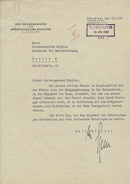 (1905-1981) Nazi German architect and Minister of Armaments and War Production, convicted of war crimes at Nuremburg. Scarce war-date T.L.S. on his official letterhead, 1p. 4to., Berlin, Jan. 12, 1943 to Secretary of State Wilhelm Keppler. Speer's letter illustrates the Third Reich's desperate search for new sources of oil. In part: "...the Fuhrer brought up the topic of natural gas extraction in the Welser moorland, around Linz, which he remembers from his youth. The Fuhrer wishes the geologists to research if it is possible to find oil fields in the vicinity...Please send me the results of the research and available results...". Paperclip rust stain at top, else very good. If Hitler had searched only 75 or so miles north of Vienna he would have discovered the Matzen fields - the richest in all of Europe.