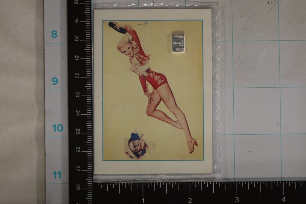 VALCAMBI .999 SILVER BAR. PIN UP IS JUNE HAVOC LEADING LADY OF 1944 BROADWAY BLOCKBUSTER "MEXICAN HAYRIDE"