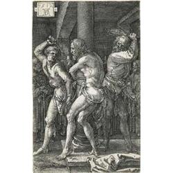 Die Geißelung. Kupferstich aus der Passion 1512. B. 8. Meder 8, c (von e). - Mit dem Monogramm und Datum in der Platte. Größe: 11,7 x 7,4 cm. Meist mit winzigem Rändchen um die Darstellung. Minimal fleckig sowie mit kleinen dünnen Papierstellen im Randbereich. Sehr guter, klarer Abdruck mit der Horizontalen durch den Schenkel Christi. Sammlungen Kunsthalle Bremen/Doublette, J. O. Entres und F. Gawet (Lugt 292/293, 2941 und vgl. 1005).