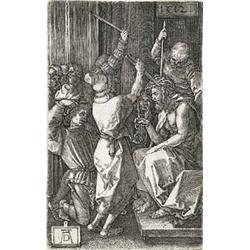 Die Dornenkrönung. Kupferstich aus der Passion 1512. B. 9. M. 9, a (von c). - Mit dem Monogramm und Datum in der Platte. Größe: 11,6 x 7,4 cm. Bis zur Darstellung beschnitten und an den Rändern aufgezogen. Kräftiger schwarzer Abdruck noch ohne Wischspuren.