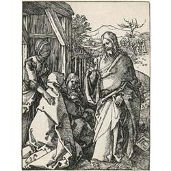 Abschied Christi von seiner Mutter. Holzschnitt aus der kleinen Passion, um 1509-11. B. 21. M. 132, I (von IV). - Abdruck vor dem Text. Mit dem Monogramm im Stock. Größe: 12,7 x 9,7 cm. Mit winzigem Rändchen um die Einfassungslinie. Klarer kontrastreicher Abdruck mit dem Sammlerstempel des Malers Peter Lely (1618-1680) in der rechten unteren Ecke (Lugt 2032).