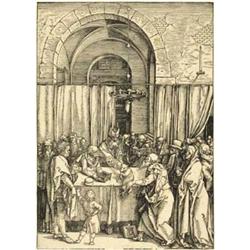 Joachim vom Hohenpriester zurückgewiesen. Holzschnitt aus dem Marienleben um 1504. B. 77. M. 189, III f (von (g). - Abdruck ohne Text um 1580. Mit dem Monogramm im Stock. Wasserzeichen: Fischblase mit Stern (M. WM 309; Nebenmarke “IM” fehlt). Größe: 30 x 21,5 cm. Meist mit winzigem Rändchen. Leicht stockfleckig und mit vereinzelten dünnen Papierstellen. Kräftiger Abdruck.