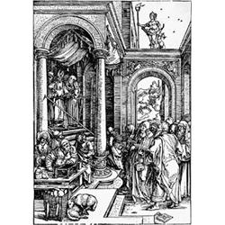 Mariens Tempelgang. Holzschnitt aus dem Marienleben um 1504/05. B. 81. M. 193, III, g (von h). Abdruck der Ausgabe ohne Text um 1600. - Mit dem Monogramm im Stock. Wasserzeichen: Lilienwappen (M. WM 122). Größe: 29,8 x 21 cm. Mit ca. 0,7 cm breitem Rändchen um die Einfassungslinie, mit parellel zur Bildmitte verlaufender Papierquetschfalte und restauriertem Randeinriß.