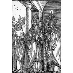 Die Bischöfe Nikolaus, Ulrich und Erasmus. Holzschnitt um 1508. B. 118. M. 233, e. - Mit dem Monogramm im Stock. Größe: 20,7 x 13,8 cm. Unter geringem Verlust der Darstellung an den Seitenrändern und Oberrand beschnitten sowie mit neuer, in brauner Feder gezogener Einfassungslinie. Mit vereinzelten schwachen Stockflecken.