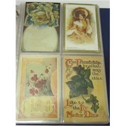 ALBUM OF 118 POSTCARDS. Consists of 25 European postcards, 35 New York City Postcards, 34 Victorian advertising papers, and 24 floral decorated poetry postcards.