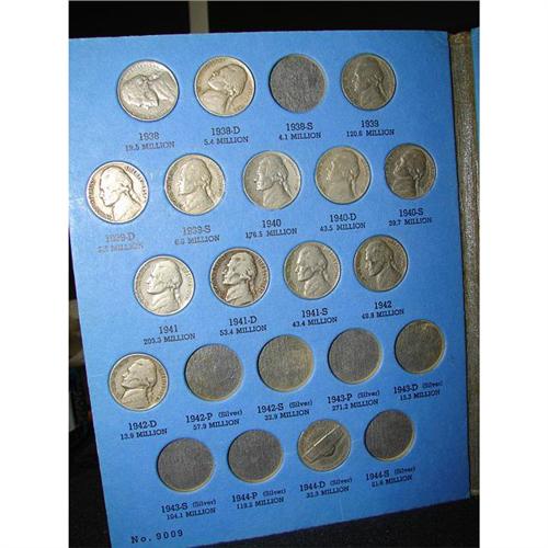 ALBUM OF U.S. JEFFERSON NICKELS. 1938 to 1961. Consists of 54 coins. Missing 1942-P, 1942-S, 1943-P, 1943-D, 1943-S, 1944-P, 1944-D, 1944-S, 1945-P, 1945-D, & 1945-S. Set is in blue Whitman album.