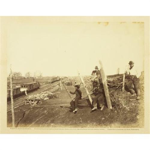 <B>ALBUMEN PHOTOGRAPH MANASSAS JUNCTION, VIRGINIA MARCH 1862.</B></I> This image, photographed by Barnard & Gibson, of the junction of the Orange and Alexander and Manassas Gap Railroad, 27 miles from Alexandria, was the northern line of the Confederates from the battle of Bull Run until early spring of 1862. This is the image taken by T. H. O’Sullivan in March 1862. This photograph printed by A. Gardner, Washington D. C. and is in <I>Gardner’s Photographic Sketch Book of the Civil War</B></I>, 1865. 9” x 6.75” mounted on card 15.75” x 12”. <BR><BR><B>Condition:</B></I> Fine, nice contrast, some foxing on image.<BR><BR><b>Shipping:</b> Flat Material, Small (<a target="_blank" href="http://www.heritageauctions.com/common/shipping.php">view shipping information</a>)