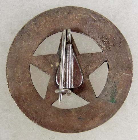 Approx. 1 11/16" in diameter. Pinback. This is a round badge w/ a cut out star in the center. Nickel construction.