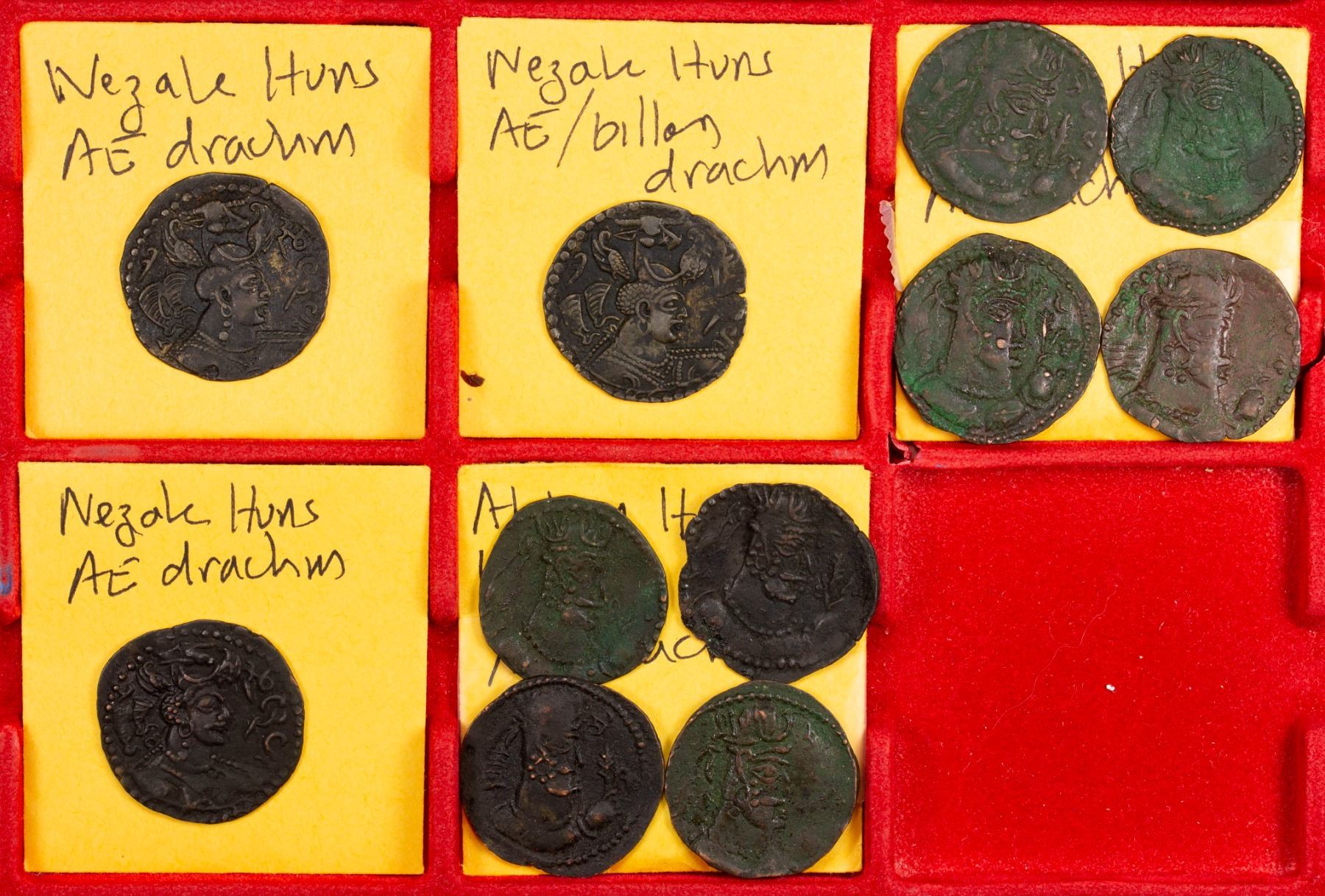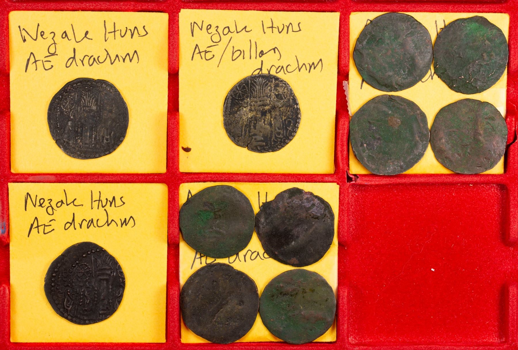 ALCHON HUNS: LOT of 11 copper coins, including Göbl-150, Alchon Huns, anonymous, often assigned to Narendra, bust right with bunch of plants, uniface (8 pcs, average F-VF, some with light porosity, and Göbl-198, Nezak Huns, bust right with bull's head winged crown // fire altar & 2 attendants (3 pcs, average VF or slightly better); retail value $400, lot of 11 pieces.