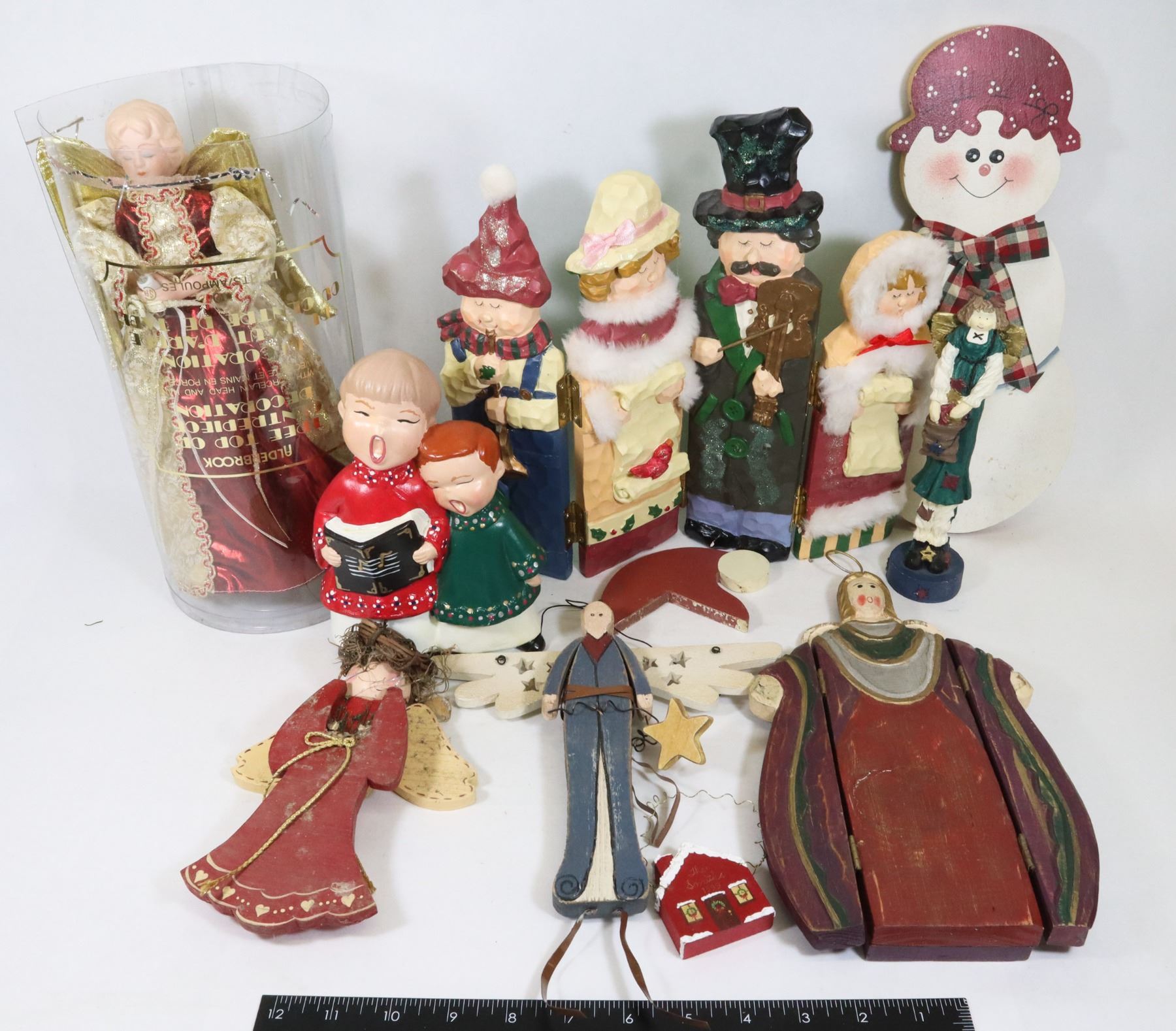 HAS PORCELAIN HEAD AND HANDS SOLD WITH VARIOUS WOODEN CHRISTMAS DECORATIONS, CERAMIC CAROLERS